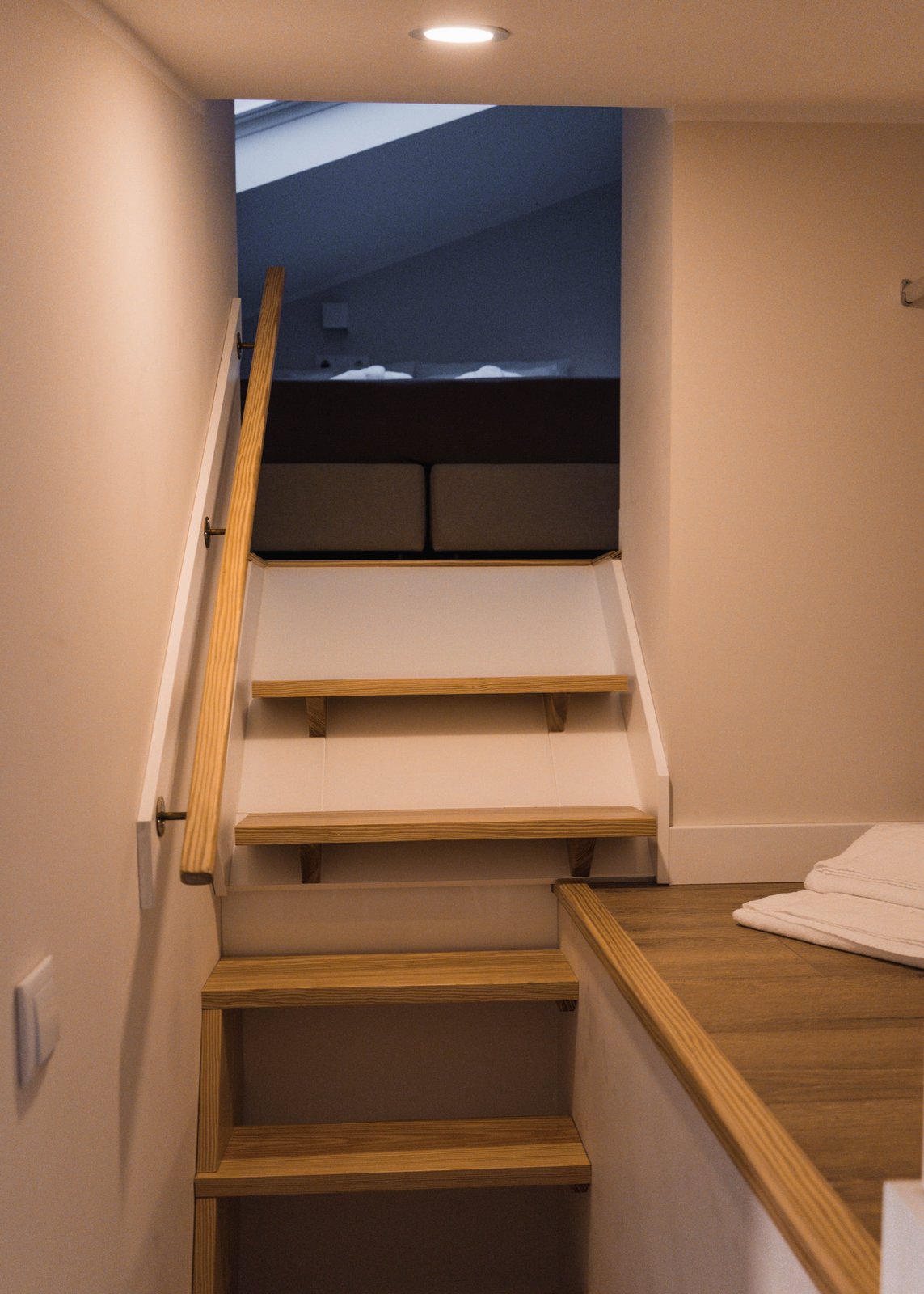 De design contemporâneo em tons neutros, este quarto com 29m2 detém de uma cama de casal e duas individuais ou quatro camas individuais.