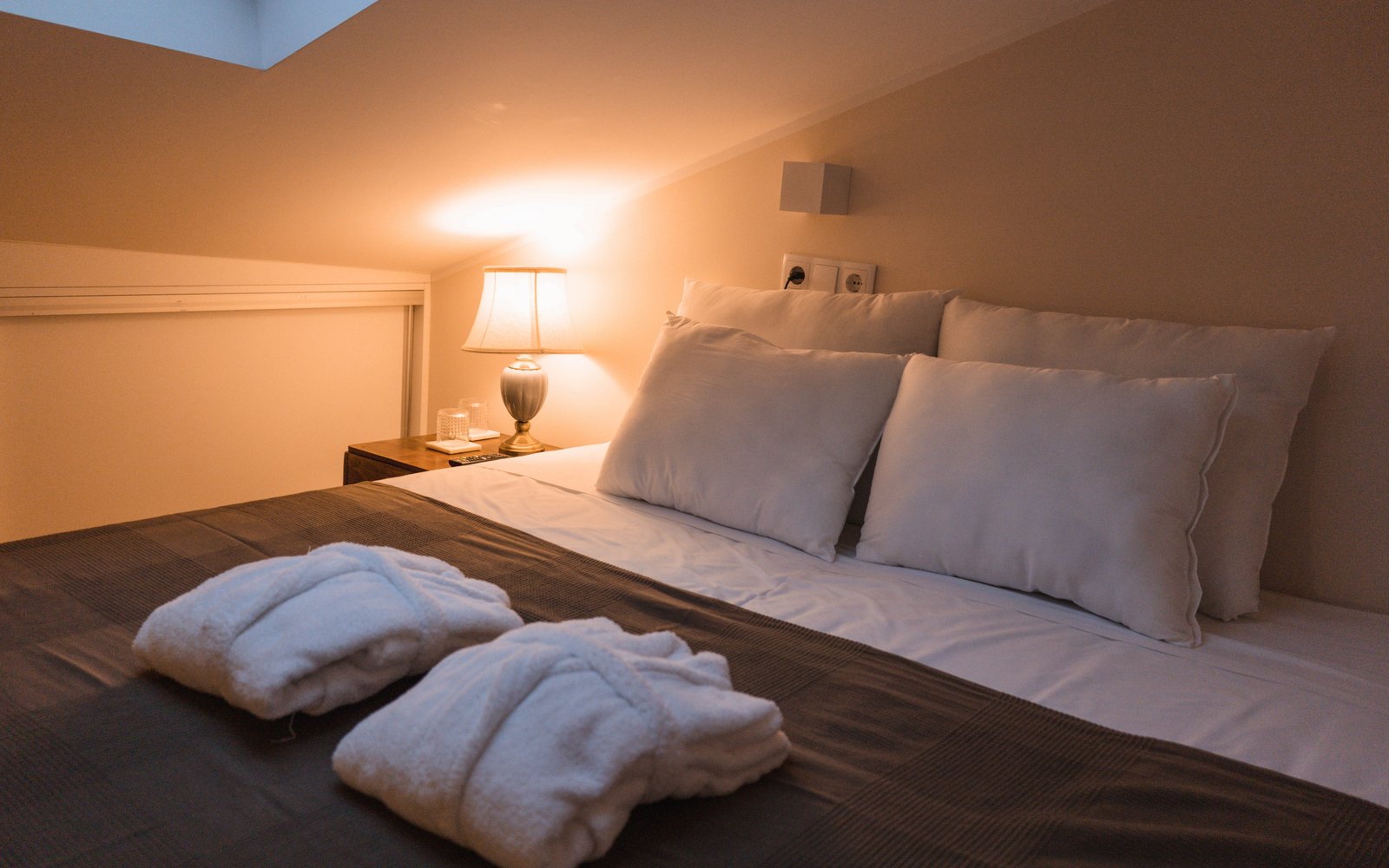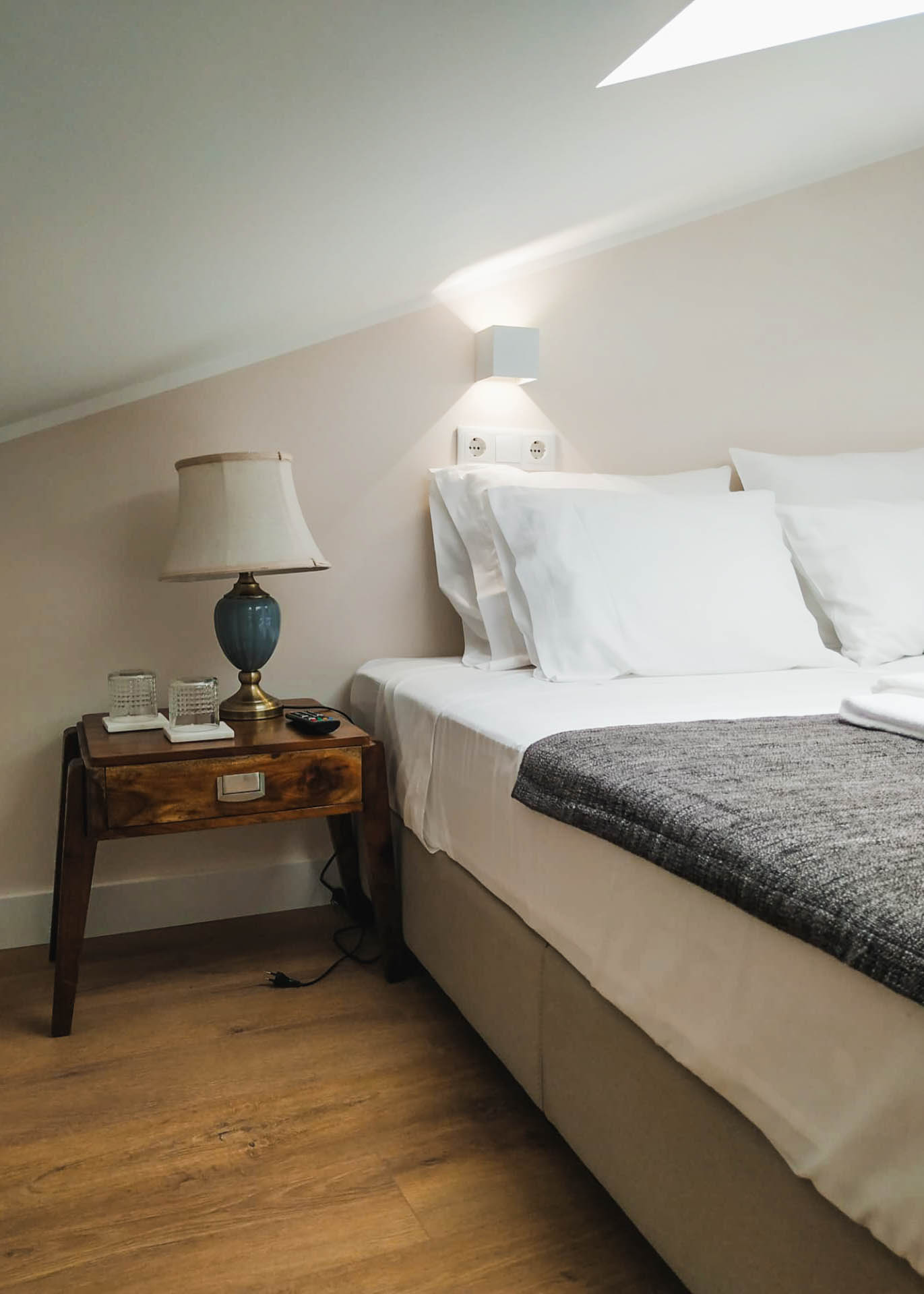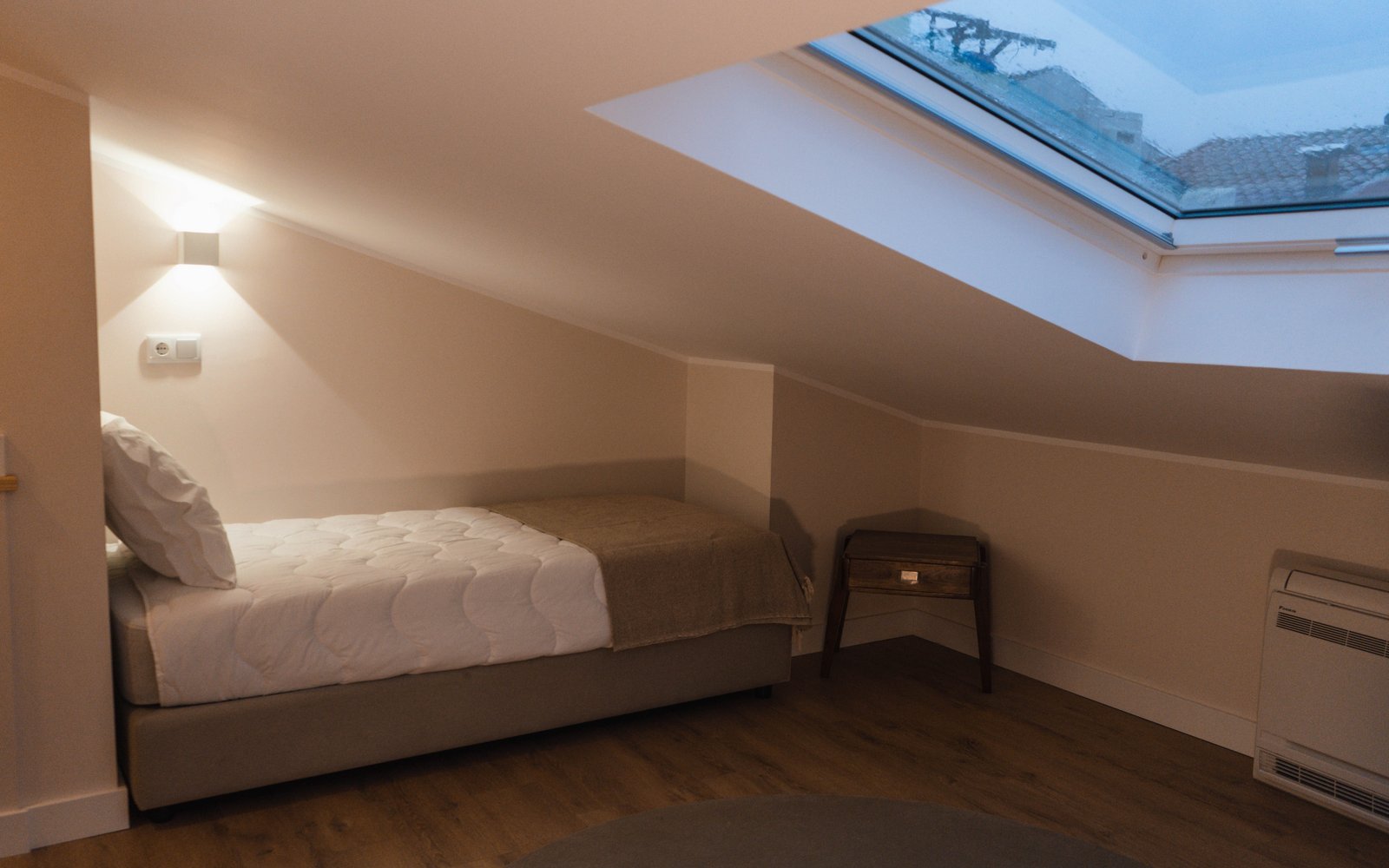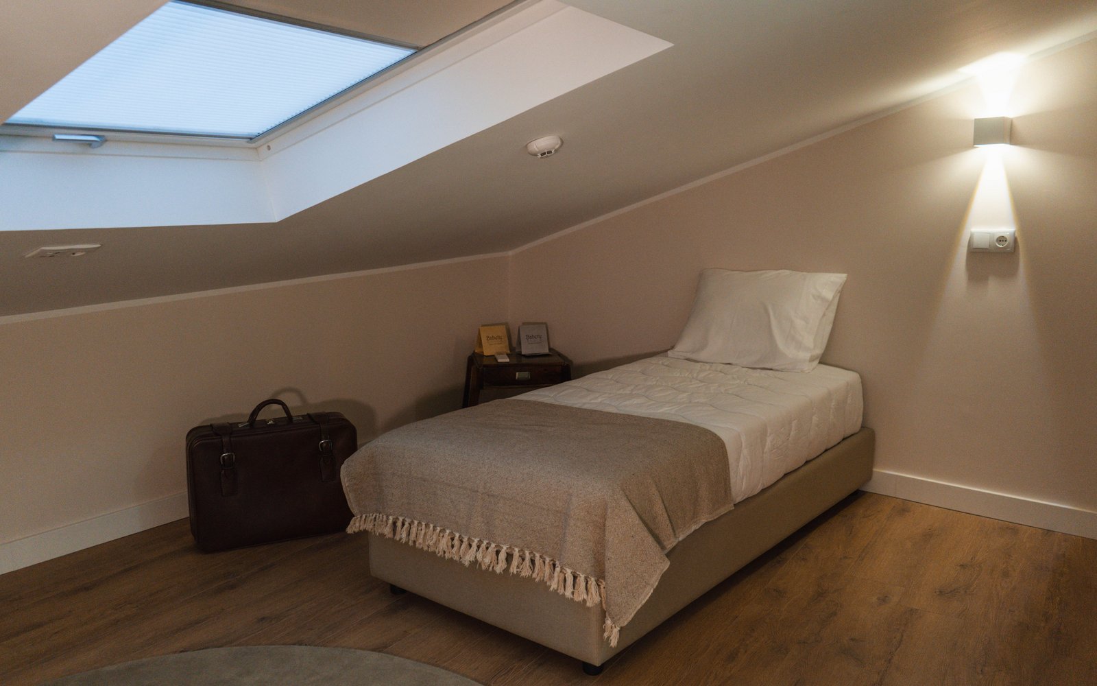 De design contemporâneo em tons neutros, este quarto com 29m2 detém de uma cama de casal e duas individuais ou quatro camas individuais.